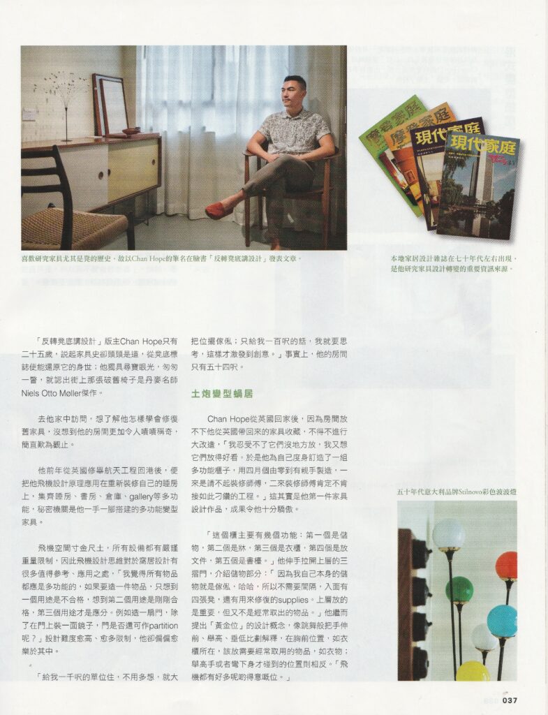 去他家中訪問,想了解他怎樣學會修復舊家具,沒想到他的房間更加令人嘖嘖稱奇,簡直歎為觀止。「給我一千呎的單位住,不用多想,就大把位擺傢俬;只給我一百呎的話,我就要思考,這樣才激發到創意。」事實上,他的房間只有五十四呎……